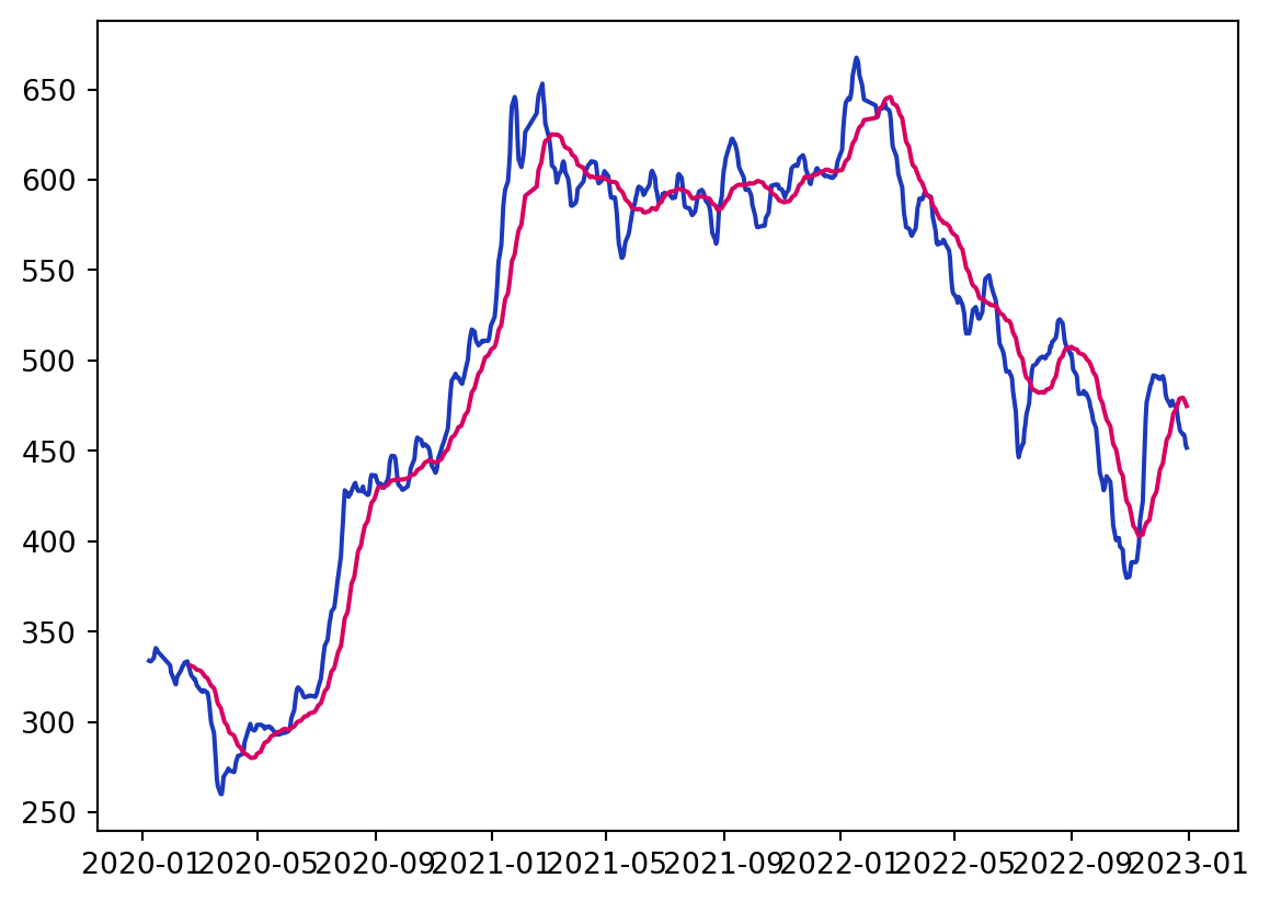 ma30 = df['Close'].rolling(30).mean()接著我們利用 matplotlib 套件繪製均線。